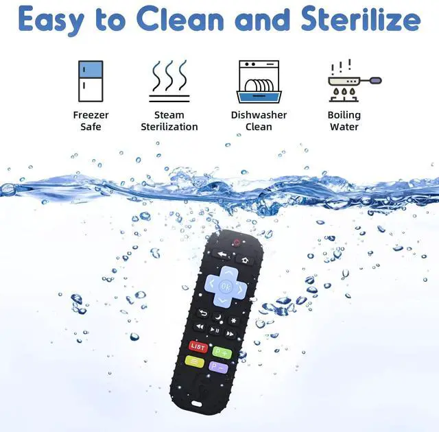-Easy to carry & clean, these remotes are firm silicone that can be sterilized for cleaning. They also have a hole at the bottom for you to use a toy strap or pacifier clip to secure it to baby's clothing or bib, stroller or cart, so that they don't drop it continuously and get it dirty.