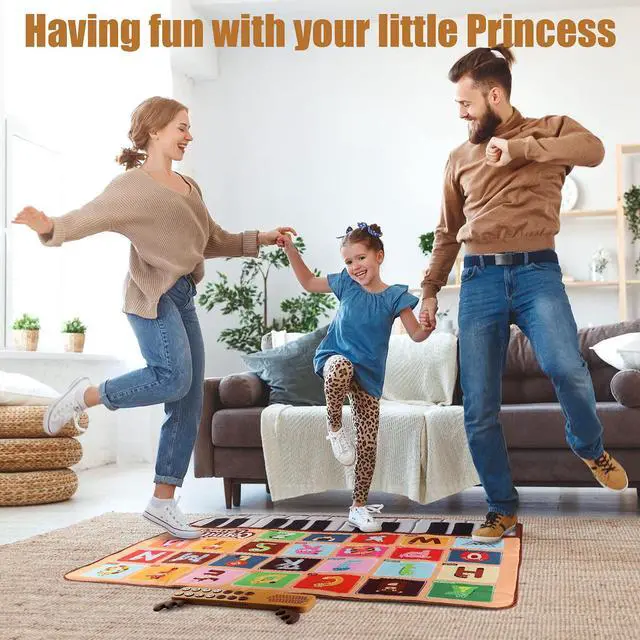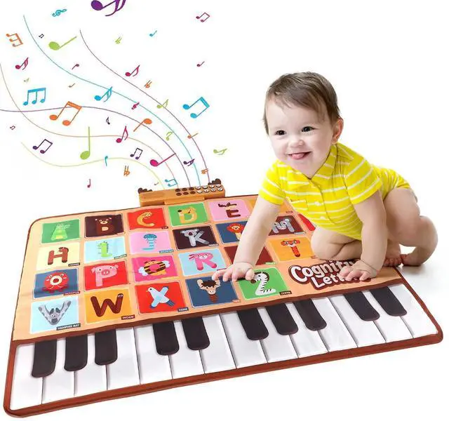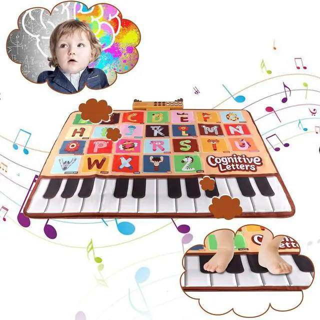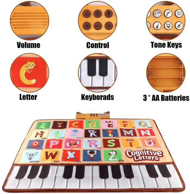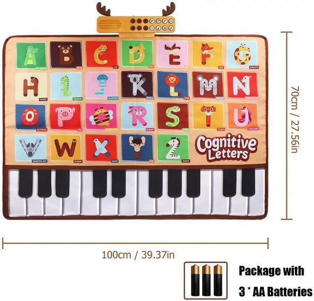 Educational learning toys for toddlers 1-3:Portable piano play mat with 26 letters, bright colors and different animal picture can help children to identify 26 letters, animals and piano keys. Playing with this musical mat, toddlers can learn so much things from listening voice and dancing on it.