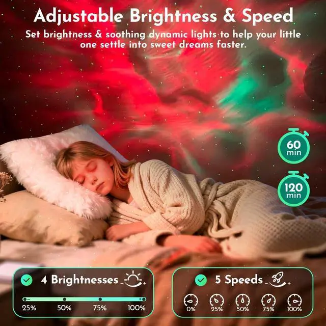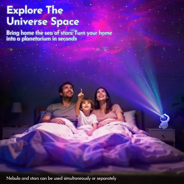Easy Remote Control & Auto-Off Timer: Take full command from the comfort of your bed with the included multi-function remote. By adjusting Ceiling Projector Light settings, switch modes, and control the stars without ever getting up. The 1-hour and 2-hour sleep timer ensures your star projector night light turns off automatically, promoting better sleep and peace of mind.