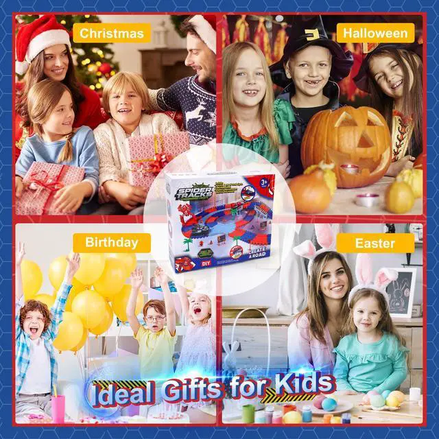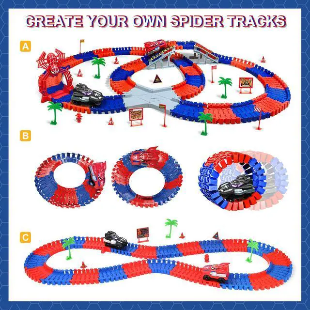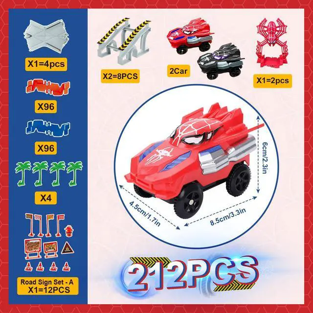 Massive 212-Piece Spider Hero Adventure Kit: Unleash epic adventures with this colossal Spider Hero playset! Build incredible race tracks featuring bridges, and fork roads using 180 flexible track pieces, 8 bridge parts, 12 road sign set, 4 tree and 4 fork road tracks. Zoom into action with 2 electric Spider hero cars (requires 1 AA battery). Watch it conquer obstacles! Perfect for kids 3-9 years old who love monster trucks, toy cars, and building amazing worlds.