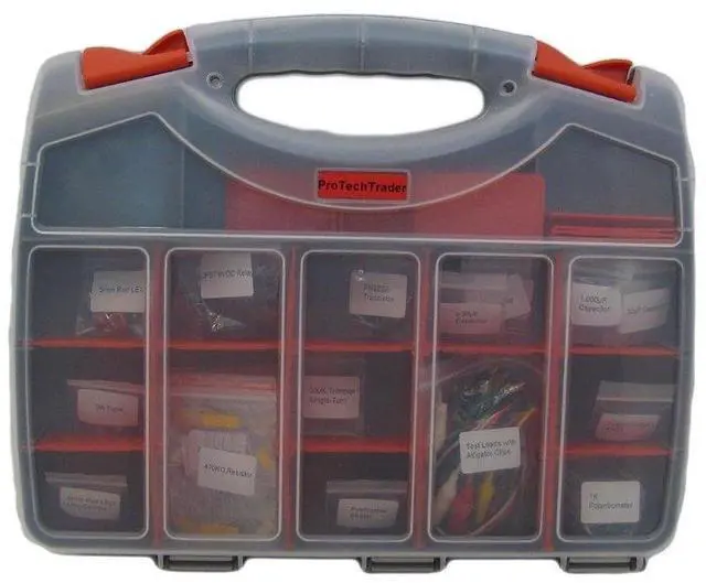 The ProTechTrader Make: Electronics Component Kit 1 has been designed to be used with the second edition of Charles Platt’s hands on learning book, Make: Electronics. Rounding up all of the necessary components can be time consuming and frustrating and we think learning electronics should be fun and exciting, so we’ve created the ideal component kit for experiments 1-11. The component shopping has been done so you can hit the ground running. You can rely on the ProTechTrader Component Pack 1 to supply you with the necessary components you’ll need for chapters 1 & 2 which cover experiments 1 - 11 of the Amazon Best Seller Make: Electronics: Learning Through Discovery 2nd Edition by Charles Platt and all are housed in a durable easy to carry double-sided plastic organizer. Each of the components are clearly labeled for easy access.