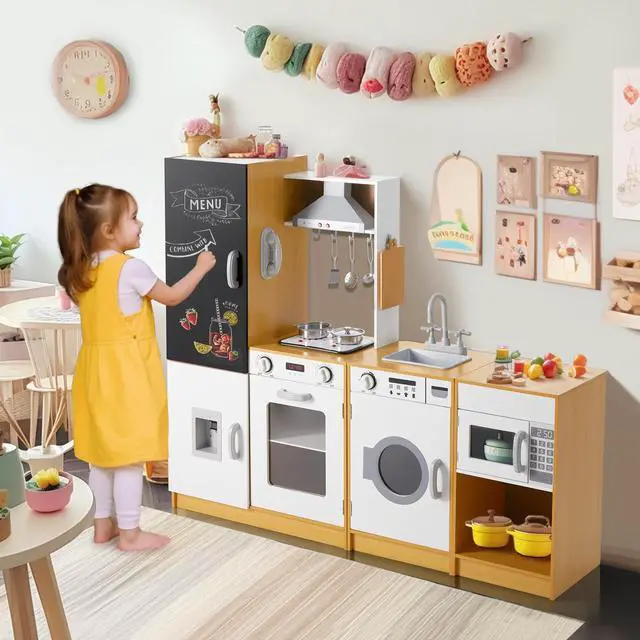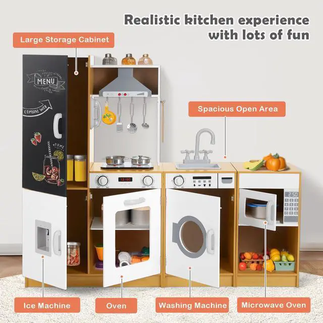 JOYDIAS Wooden Free Combination & Movable Pretend Toddler Kitchen Set includes water dispenser, microwave, oven, washer, sink, phone, etc.