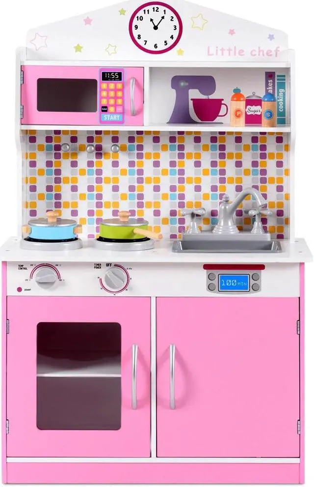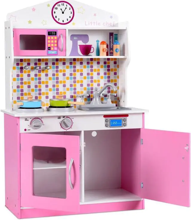 Realistic Design:A realistic toy kitchen design that includes oven, sink, stove, microwave, etc. It closes to life, providing much fun to family.