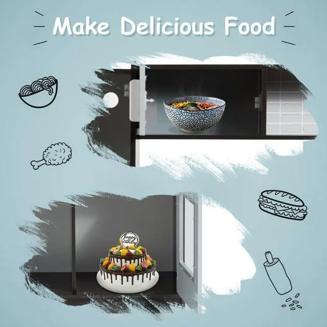 Complete Kitchen Set: This children's kitchen is equipped with most kitchen utensils, such as a refrigerator, microwave, oven, sink with simulated sound, gas stove with sounds knob, etc. Spacious open shelves and enclosed cabinets are enough to store kitchen essentials.