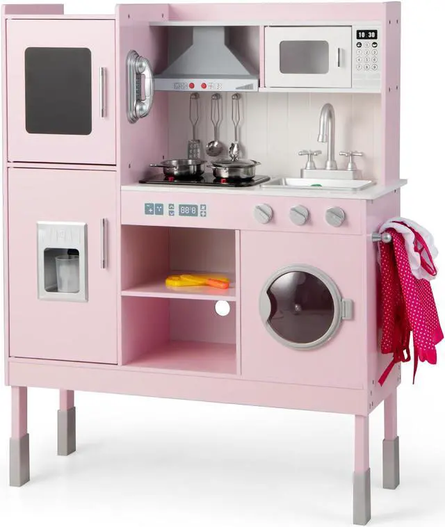Reliable Design and Rich Storage: Crafted from high-quality materials, the kids kitchen promises to accompany kids to grow up. And the anti-toppling device is equipped for stability and safety. What's more, the sufficient storage space holds a variety of items within reach.