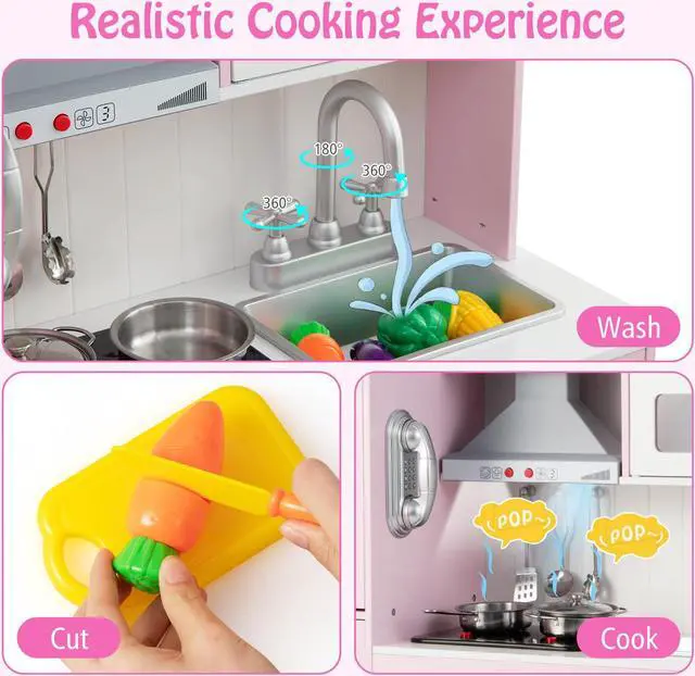 Immersive Cooking Experience: With this toy kitchen, kids can wash, cut and cook to enjoy a realistic cooking experience. Besides, the range hood with lights and sounds adds fun. While the microwave oven, telephone, ice maker and washing machine bring different fun for toddlers.