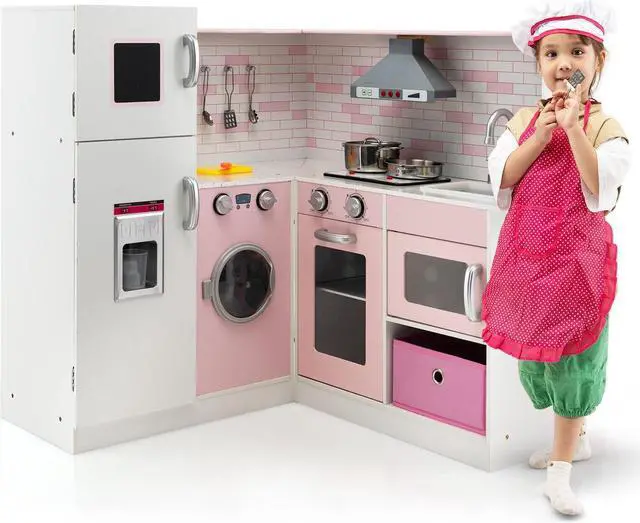 All-in-One Kitchen Play-set: This pretend wooden play kitchen comes with multiple simulated appliances, such as ice maker, oven, stove, washing machine, etc, which allow kids to immerse themselves in the play house game. Write today's recipe on the blackboard and then explore the kitchen world!