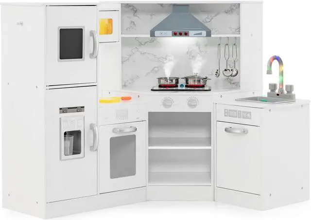 Separated Washing Basin: The kids corner kitchen playset comes with a separated washing basin with a water circulation system. The rotary faucet and detachable sink enable your little one to pretend to wash vegetables. Besides, the faucet also features fun sounds and lights. It requires 2 AAA batteries, not included.