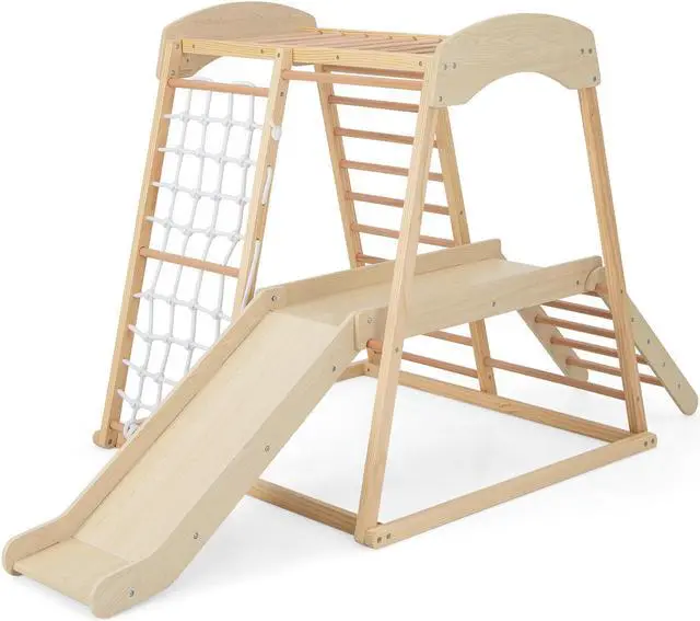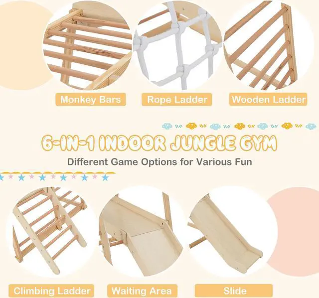 6-in-1 Indoor Jungle Gym: This indoor wooden playground offers kids different game options for various fun. There are monkey bars, rope ladder, wooden ladder, climbing ladder, waiting area and slide. As a result, children will have hours of fun adventures. Suitable ages: 1+ years old.