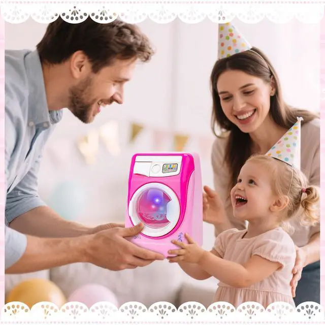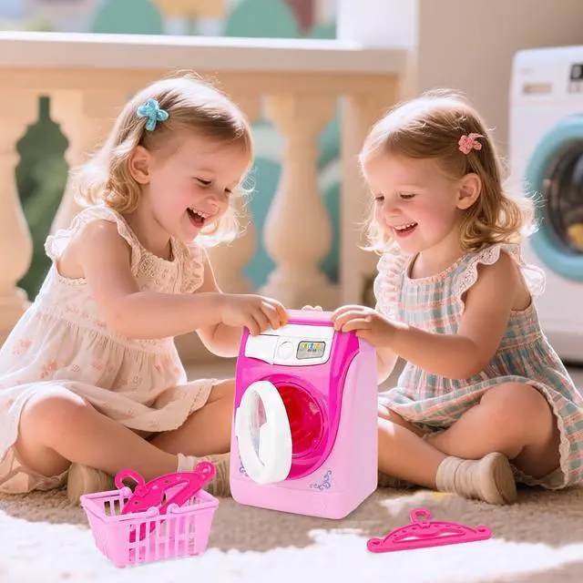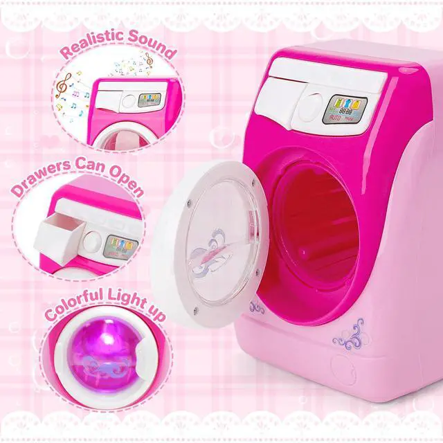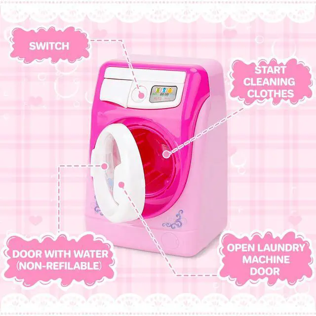 PERFECT GIFT:This mini washing machine set would be a great gift. They can make children simulate scenes, role plays, and increase parent- child interaction.deAO washing machine set is made of durable high-quality materials.