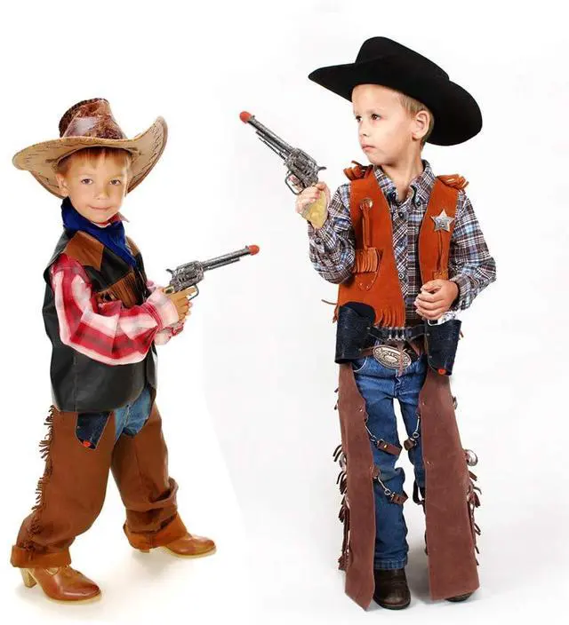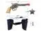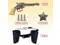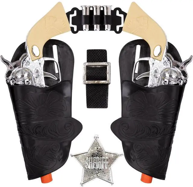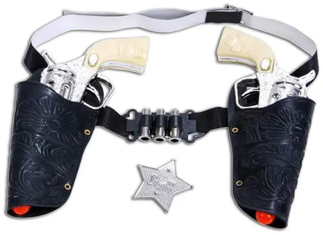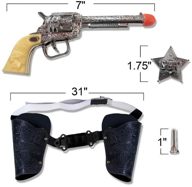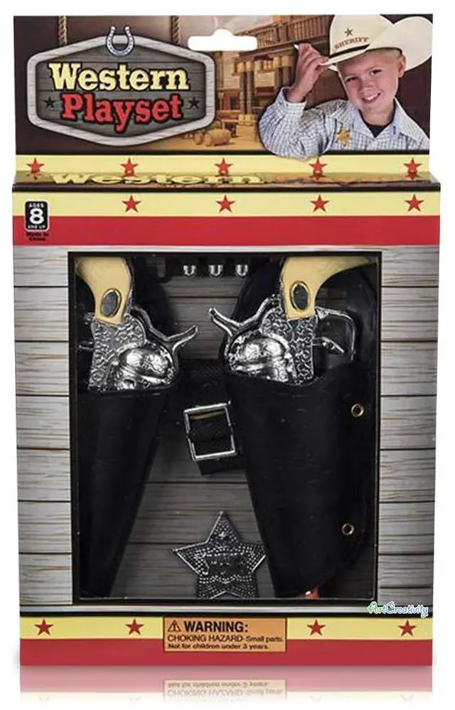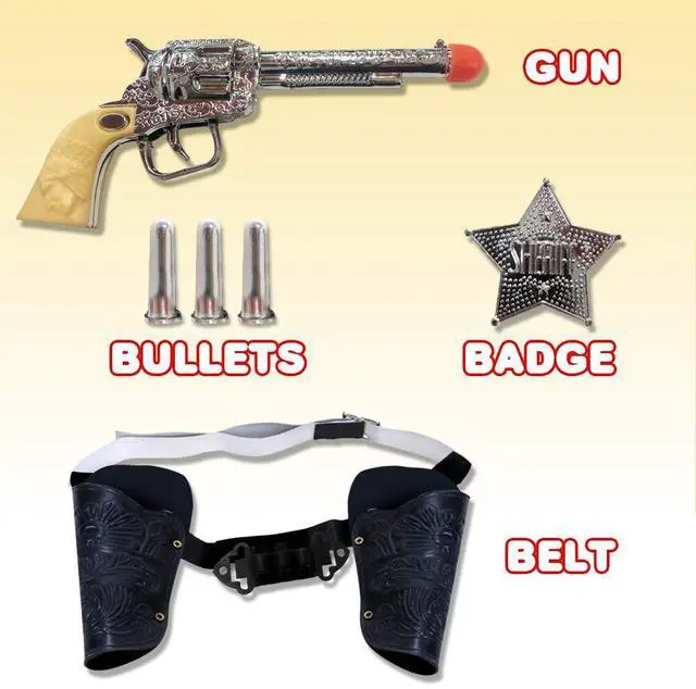 This set old western action belt set Includes 2 pistols, holsters, belt, badge, and 3 play bullets. The belt can be adjusted to fit most kids.