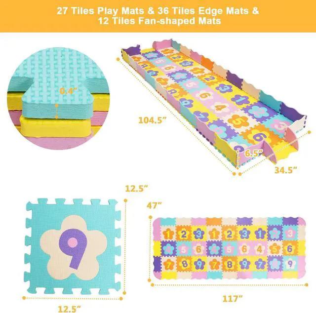 Large Coverage Space: This 75 pieces of baby play mat includes 27 tiles playmats, 36 tiles edge mats, and 12 tiles fan-shaped mats. Playmat will provide kids with a comfortable space to play and crawl. Overall Expansion Size: 117" x 47" x 0.4", Fence Up Size: 104.5" x 34.5" x 6.5", Individual Number Mat Dimensions: 12.5" x 12.5".