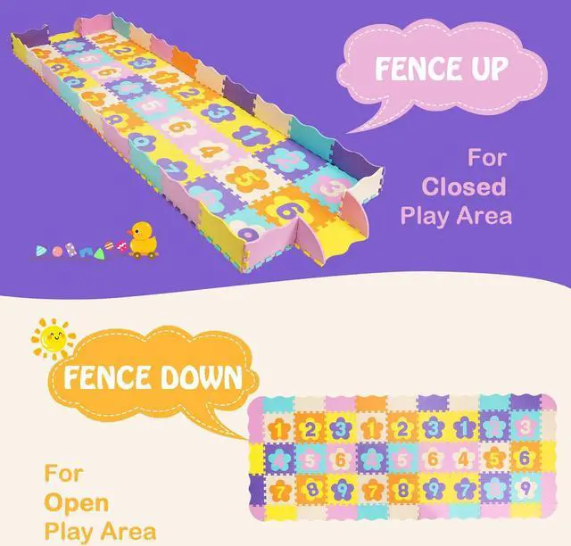 Wide Range of Applications: With a 6.5" high fence, it is convenient for kids to put on balls and other toys. In addition, kids can sit on it to enjoy a happy time at holiday parties and parent-child interactions. Plus, it can also be combined into different shapes, such as boxes and houses.