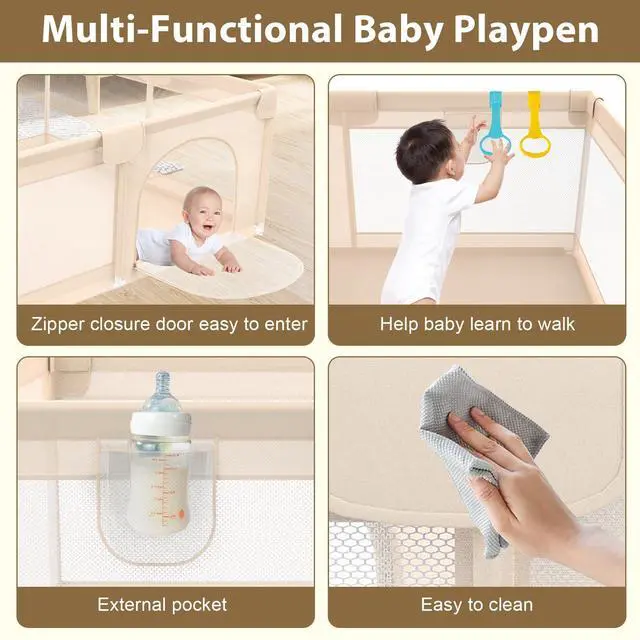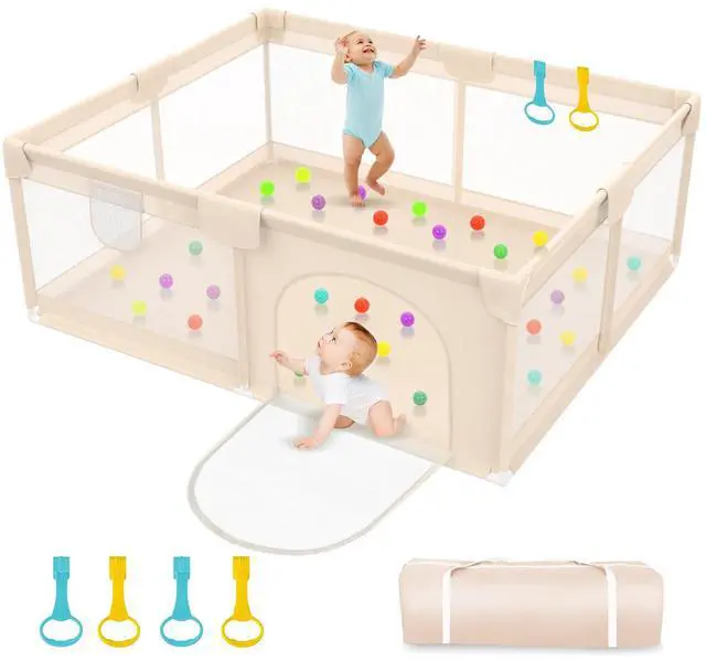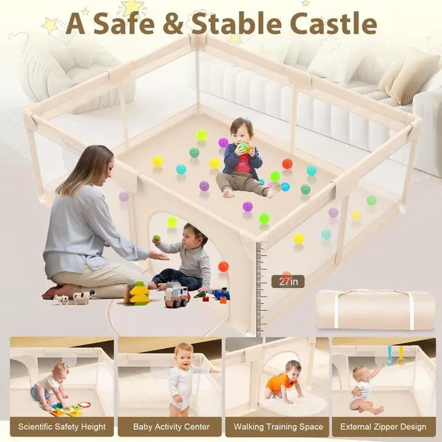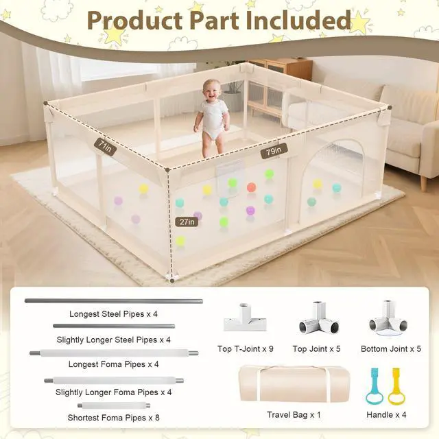 Baby Playpen Make Baby in a Safe Play Area extra large play pen, the inside measures 50x50/71x59/79x71 inches, is more than just a confined play area. It is a baby's favorite playpen where your little ones can crawl, roll, and take their first steps in safety. This extra-large baby play pen keeps your baby engaged and nurtures their independence without compromising their safety. About Baby Playpens Q: Is this crib easy to install? A: The convertible crib is very easy to assemble and disassemble, moms can refer to our installation video and the instruction manual that comes with the product, usually it only takes a few minutes to install and disassemble. Q: What age group is this enclosure suitable for? A: Our convertible crib is designed to be 27 inches tall and is perfect for babies 6 months to 3 years old, so you don't have to worry about your baby climbing out of the playpen.