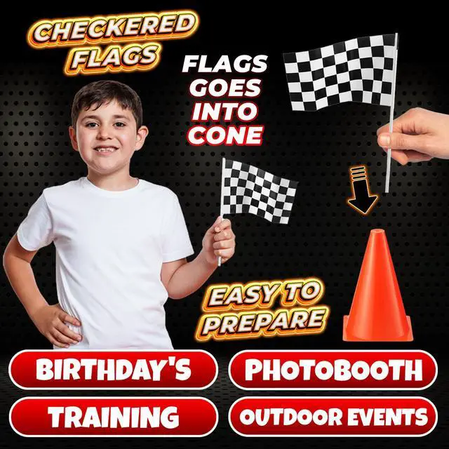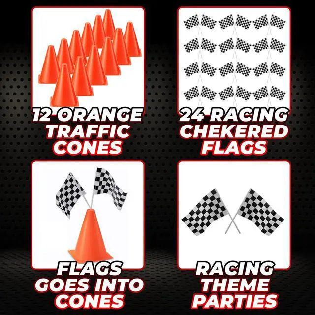36 PCS- 12 MINI CONES AND 24 CHECKERED FLAGS: Each Race Car Birthday Party Decoration Pack includes 36 total pieces. Youll get 12 bright orange mini traffic cones (8 tall with a 5.5 base) and 24 black-and-white checkered flags (6" x 4") on 8" plastic sticks. Perfect for racing-themed centerpiece table decor, party favors, or finish line fun for kids!