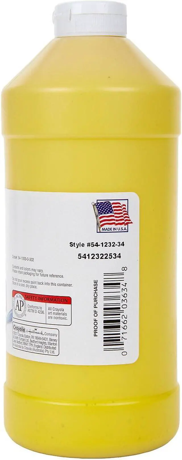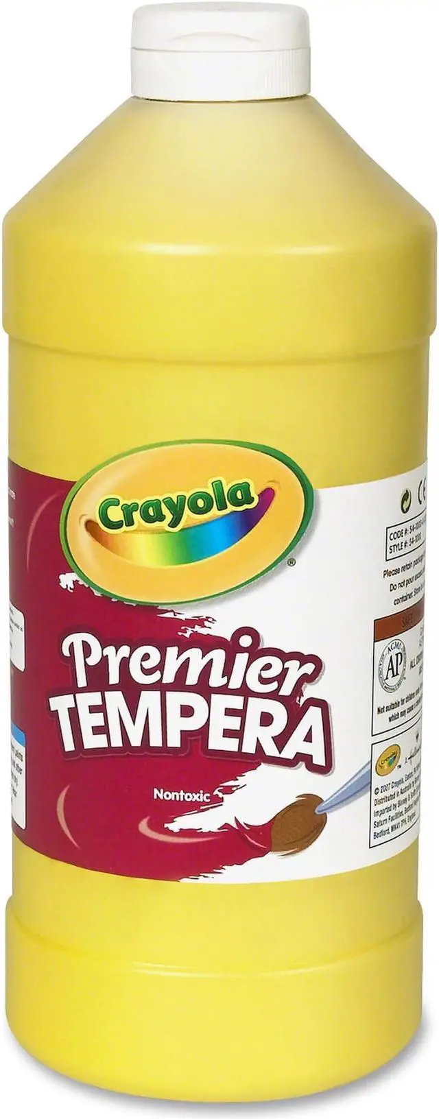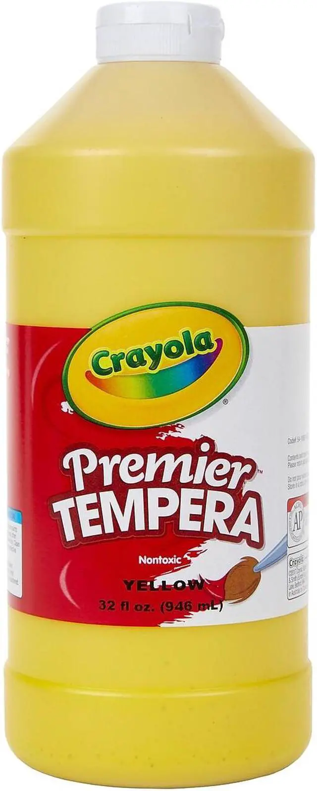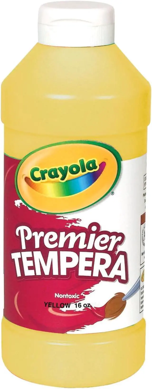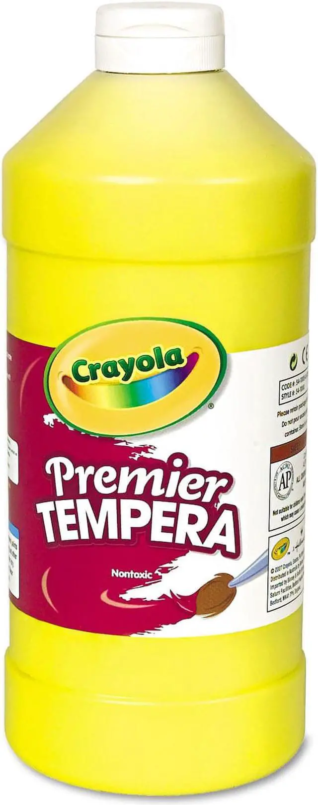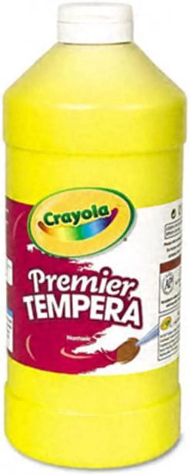 Premier Tempera provides rich consistency, ultimate opacity, superior secondary color mixing, and brilliant colors to match a child's vivid imagination. Creamy consistency for smooth laydown and brush flow. One coat coverage provides excellent performance on a variety of surfaces including newspaper, cardboard, papier-mâché. Color(s): Yellow; Assortment: N/A; Chemical Compound: Tempera; Capacity (Volume): 32.000 oz.