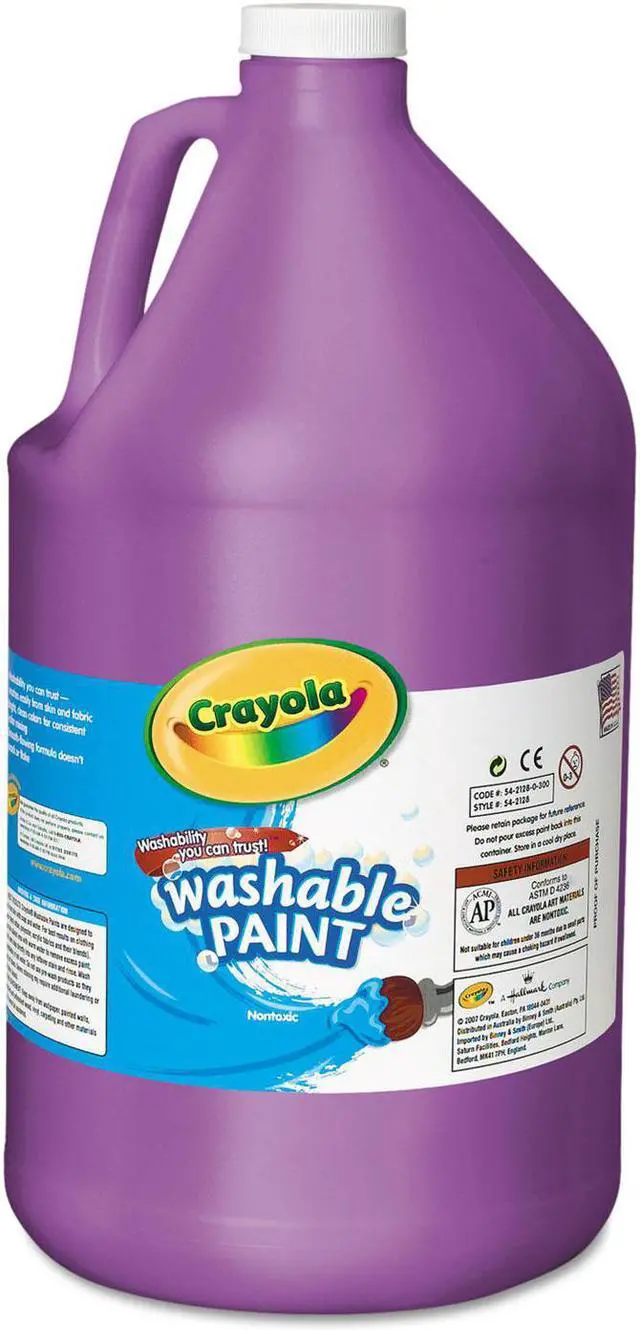 Crayola 1 Gallon Washable Paint - 1 gal - 1 Each - Violet Washable Paint combines vibrant color with true washability. Students can express themselves freely because paint cleans up with just soap and water and washes easily from skin and most children's clothing. Nontoxic paint offers a creamy consistency that users prefer. Mix colors to create shades perfect for any artistic idea. These paints can be combined with crayons and other art products for exciting and daring projects. Super-size bottle of this washable paint will keep you supplied long-term so you're always ready when inspiration strike.