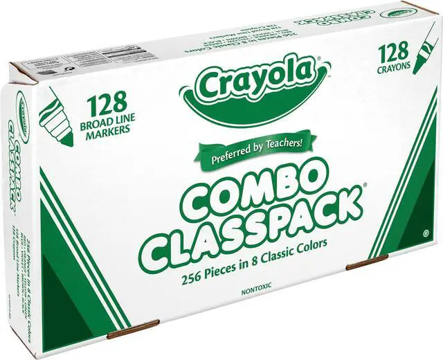Versatile set combines two Crayola classics into one pack. This Crayons and Markers Classpack includes classic crayons and classic broad-line markers in eight different colors. The set includes 128 crayons and 128 markers - enough for the whole class. Wax crayons feature a soft texture that glides smoothly on paper. These nontoxic crayons won't make a mess and are double-wrapped to resist breakage. High-quality, true-to-color ink of the markers add bold color to artwork, school assignments and other creative projects. Sturdy conical tips make them ideal for coloring in large areas. They also work well for drawing thin lines or dots. Broad-line markers lay down plenty of color and won't smudge or bleed through paper. Crayola Markers contain recycled plastic resin, which keeps hundreds of tons of plastic out of landfills every year.