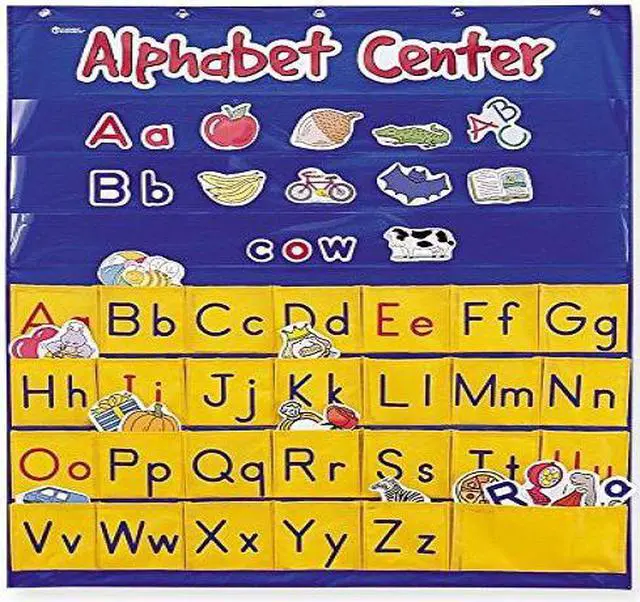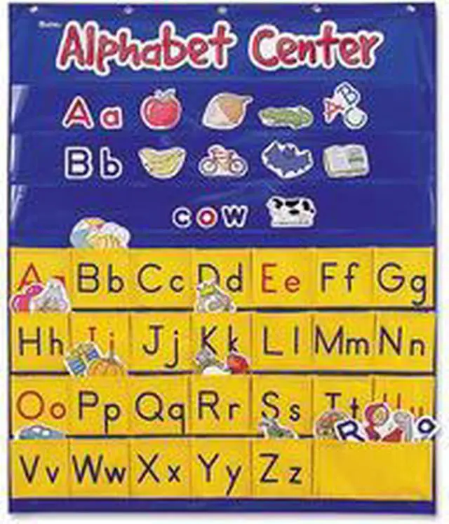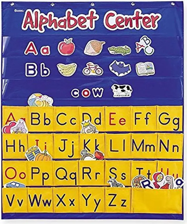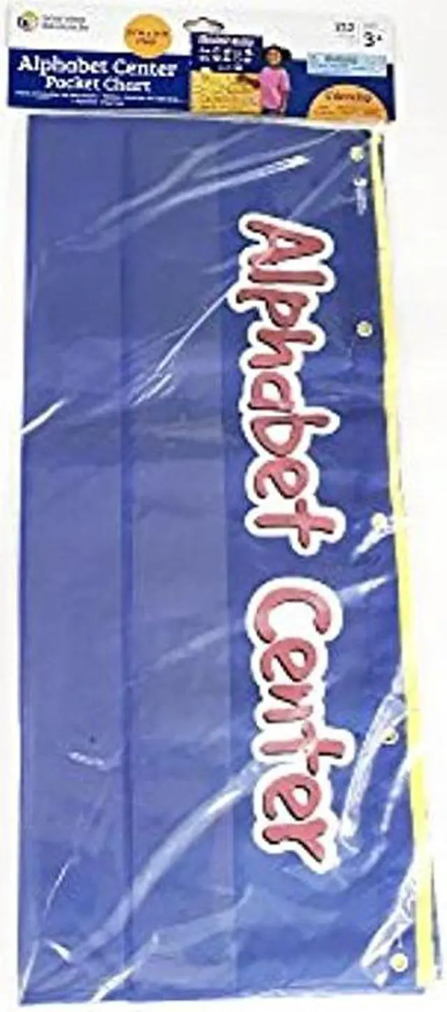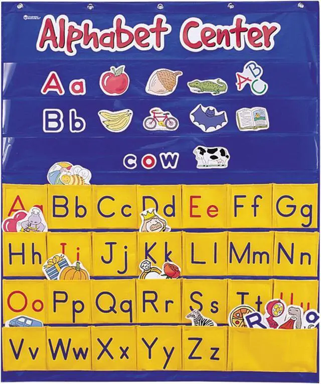 Letter, word and picture recognition are easy-to-learn with this colorful Alphabet Center Pocket Chart. Practice letter and sound identification, word building, spelling and more. The 28 W x 34 H nylon chart has three clear pocket rows for card display, 26-letter pockets for activities and an extra storage pocket. Set includes 156 picture cards (picture one side, word on the other), 52 letter cards, four blank cards and activity guide. Use alone or combine with Reading Rods® Alphabet Books (LER 7097). Ages 5 to 6 years.