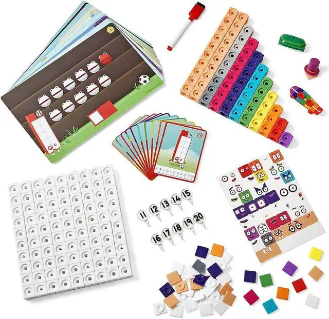 - Each set includes 155 MathLink Numberblocks Cubes, 52 faceplates, 44 stickers, 10 numberlings, 10 character cards, 15 double-sided Write 'N' Wipe Activity Cards, Fourteen's Skateboard and Helmet, Twenty's Top Hat, 1 write and wipe pen and 1 activity guide.