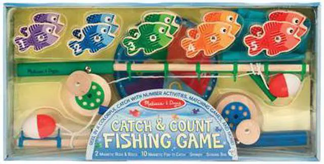 Catch some laughs and learning with this wooden magnetic play set--complete with working wind-up reel! The 10 magnetic fish are numbered and patterned to enrich matching, sorting, and counting activities, and two wooden rods make collecting them a blast! Kids can use the spinner to play as a game, or just have fun collecting the pieces over and over again. Either way, there's plenty of fun in this sea!