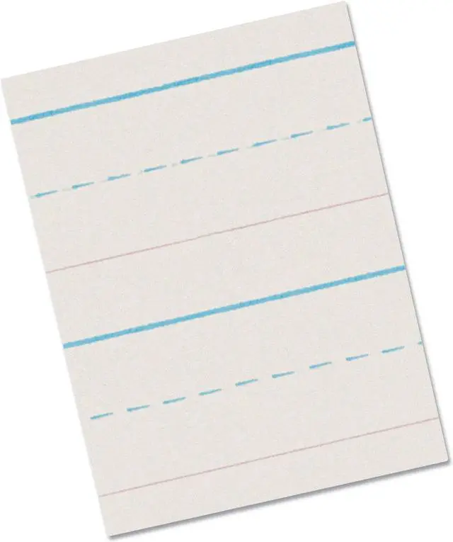 Clean white newsprint paper printed on both sides with a blue headline, broken blue midline, red baseline. This paper is ruled 5/8" the long way with a 5/16" dotted midline and 5/16" skip space. This ruling is recommended for Kindergarten. Rulings conform to the D'Nealian handwriting program. Measures 11" x 8.5". Includes 500 sheets.