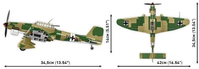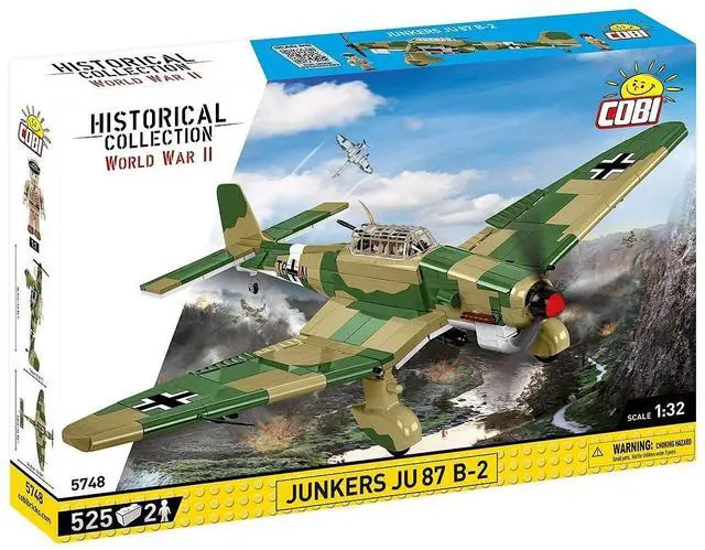 The Ju 87, a highly recognizable WWII dive bomber, first flew in 1935 and saw combat during the Spanish Civil War in 1938. Known for its distinctive "W"-shaped wings, the Junkers became a symbol of Luftwaffe power and was successfully deployed in battles across Poland, Scandinavia, France, Crete, and during Operation Barbarossa. The Ju 87 B-2 version was specifically used in Africa. COBI's 1:32 scale model of the Ju 87 consists of 525 blocks and features realistic tropical camouflage with detailed prints. The model includes a movable propeller, ailerons, and rotating wheels with rubber tires.