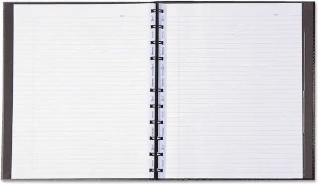 The Blueline MiracleBind Notebook offers the simplicity of a notebook but with the added flexibility for personalization. The unique and clever construction allows the premium pages to be easily added, removed or repositioned. Unlike traditional notebooks, the Blueline MiracleBind Notebook can also be folded back and lay perfectly flat when open to create a sturdy writing surface. Both sides of the 150 micro-perforated pages are ruled with a margin and printed with vegetable oil-based ink. Features a repositionable vinyl pocket, index sheet, and self-adhesive tabs. Made with recycled paper and materials.