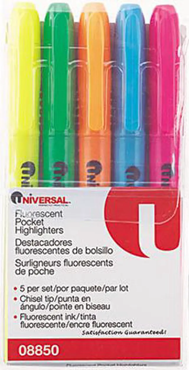 Universal Pocket Highlighters are well-designed highlighting pens that feature bright, vibrant colors. The chisel tip allows for both broad and narrow lines. Long cap with pocket clip holds firmly on either end of the highlighter so it doesnt get lost. The bright ink stands out on the page and dries quickly. Enjoy effortless highlighting with a slender barrel thats comfortable and easy to hold. Highlighter Style: Pen; Highlighter Ink Color: Assorted; Color Family: Multicolor; Highlighter Ink Color Assortment: Fluorescent Blue; Fluorescent Green; Fluorescent Orange; Fluorescent Pink; Fluorescent Yellow.