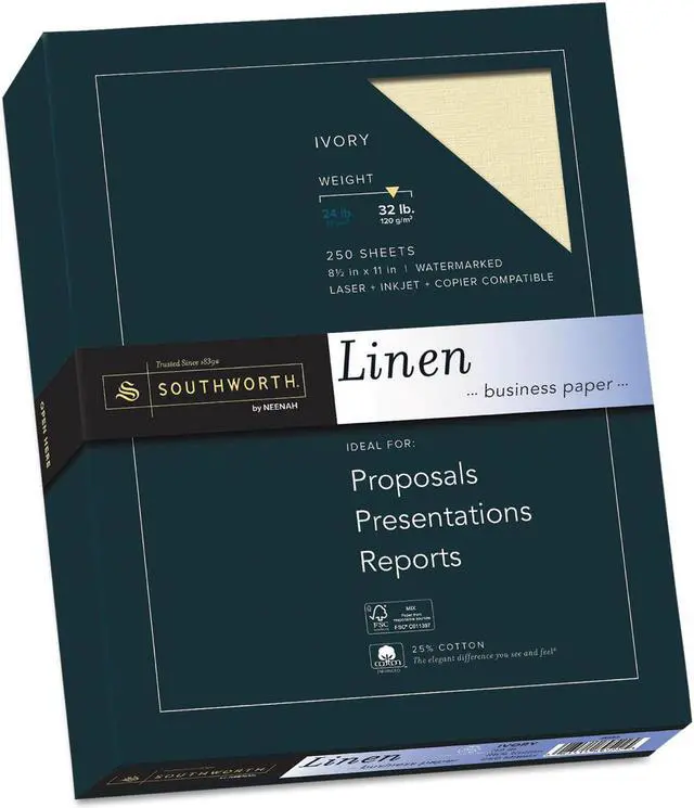 Linen business paper features 25 percent cotton content for texture and a fine linen finish. Ideal for letterheads, reports and presentations. Each premium weight sheet is acid-free, watermarked and date-coded. Paper is compatible with laser printers, inkjet printers and copiers. 32 lb. paper is made with a high percentage of recycled material.