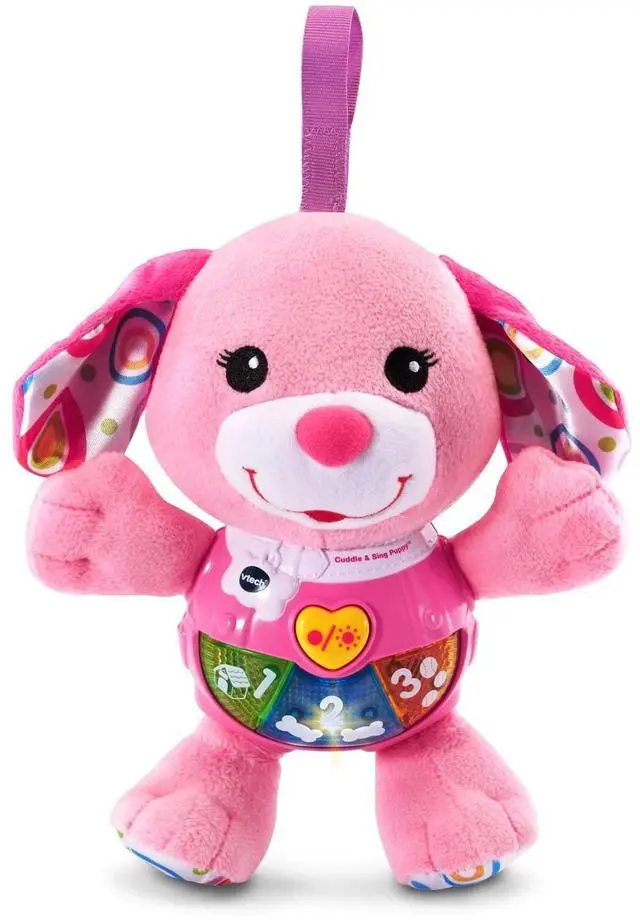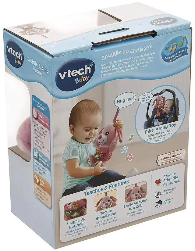 Snuggle up with the Cuddle & Sing Puppy by VTech ®. Press the buttons on the friendly puppy to hear sing-along songs, playful melodies and fun phrases. Give the pink puppy a hug while you learn about numbers and objects. The soft puppy features different textures to encourage touching and cuddling. The adorable puppy attaches to infant seats for on-the-go fun or to crib rails for at home play.