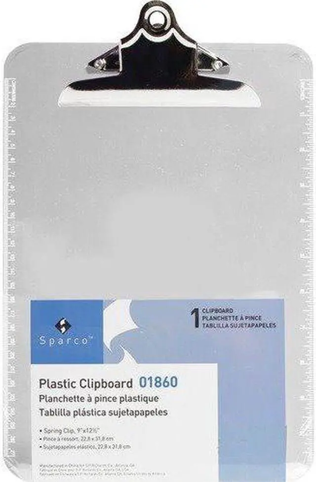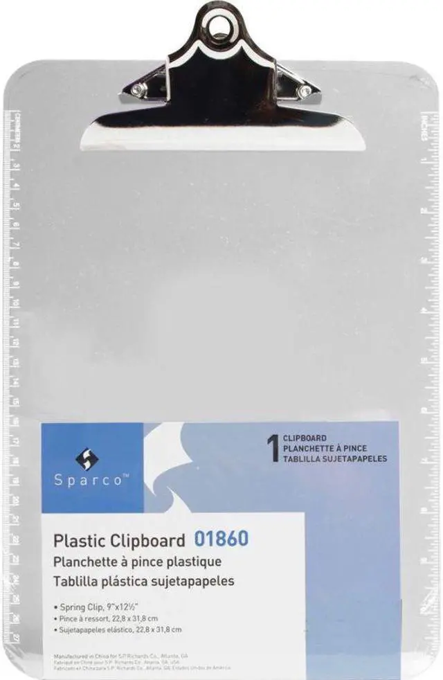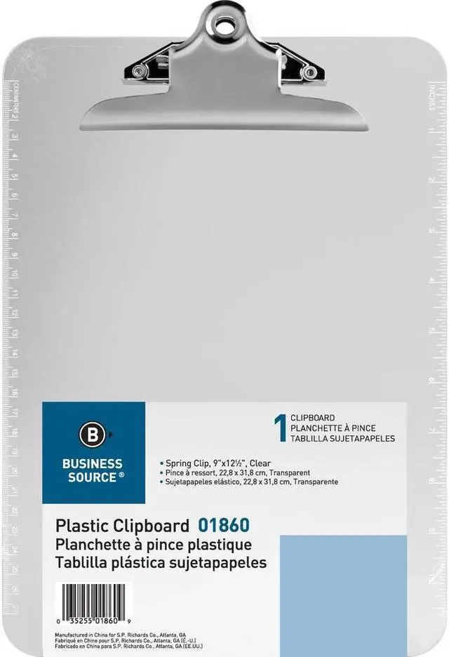Clipboard provides a stylish, functional way to write when you're on-the-go and working without the convenience of a desk. Sturdy spring clip secures paper and is made of durable metal. Aligned eyelets on the clip make it easy to hang up and store. One long side is screen-printed in Imperial ruler markings in 1/16" up to 11" for handy measurements. The other side has centimeter markings up to 27 cm. Clipboard is made of durable molded plastic for lasting use.