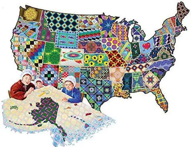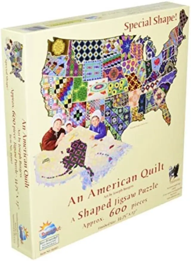 This fun and challenging 600 piece jigsaw shape puzzle contains interlocking pieces made from recycled cardboard and soy based inks (no lead). This puzzle, entitled "An American Quilt" by artist Joseph Burgess, is proudly made in the USA and is unlike ordinary square or rectangle puzzles - this puzzle forms a unique shape when finished so there are few, if any, straight outside edges!