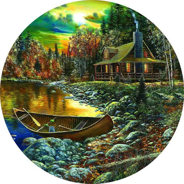 Fall Cabin 500 pc Jigsaw Puzzle by SUNSOUT INC - 500 pc Jigsaw Puzzle - Completed size: 19.5 rd" - Puzzle Artist: Jim Hansel - Eco-Friendly - Soy-Based Inks - Recycled Board - Made in the USA - Interlocking Pieces & Durable Construction