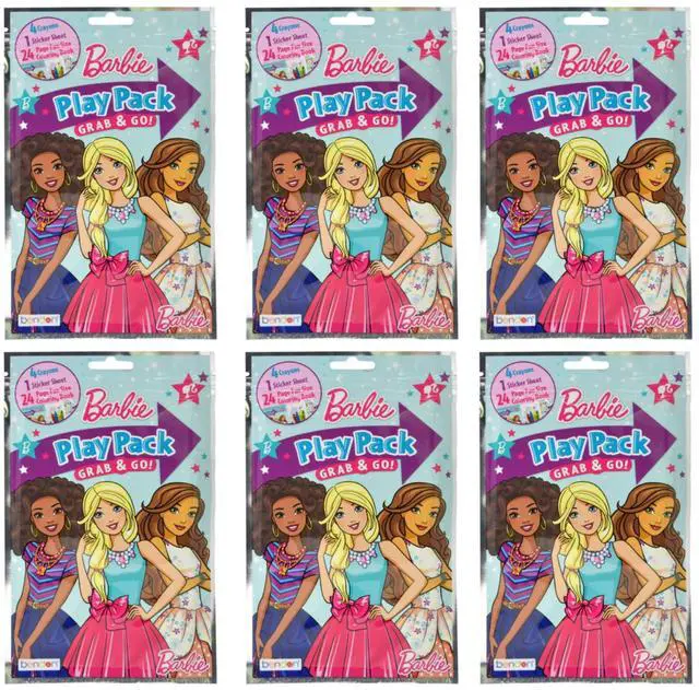 Set of 6 Barbie Grab and Go Play Pack - a cute and creative mini activity kit perfect for on-the-go fun. Kids can enjoy coloring pages, stickers, and a mini crayon set featuring Barbie and friends.