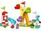 The story inspiration of the creative pretend game - the baby sends the character down the slide, then puts it in the Ferris wheel pod, spins it, and then takes them to the juice bar for a drink
