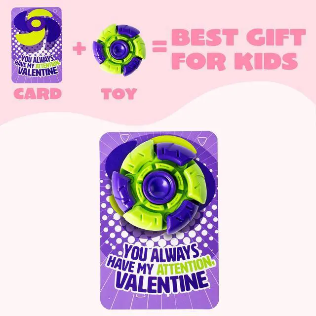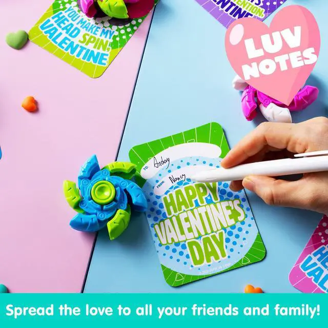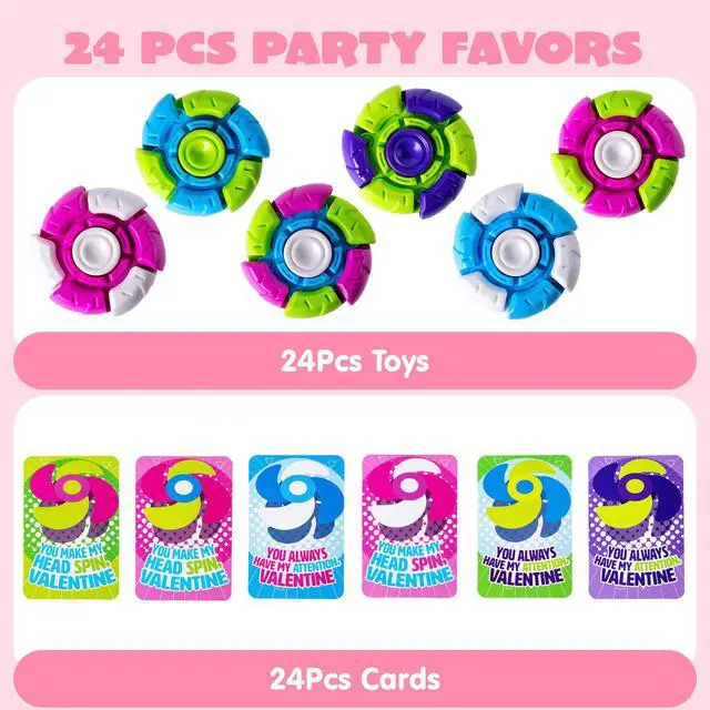 Super Value Pack: Includes 24 colorful fidget spinners and 24 matching Valentines Day cards for kids school, giving you everything you need for a complete classroom exchange.