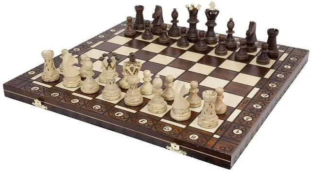 Wegiel Handmade European Ambassador Chess Set - Wooden 21 Inch Beech & Birch Board With Felt Base - Carved Hornbeam & Sycamore Wood Chess Pieces - Compartment Inside The Board To Store Each Piece