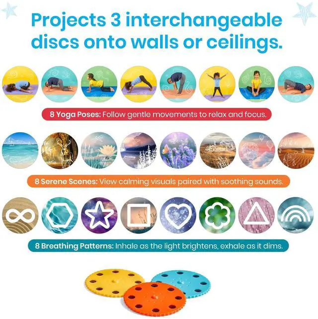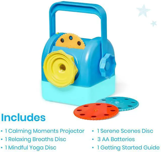 ANXIETY BREATHING TOOL: Designed for home or classroom use, the lightweight projector is easy to transport anywhere, with disc storage built in, and featuring a glowing night-light at the base.