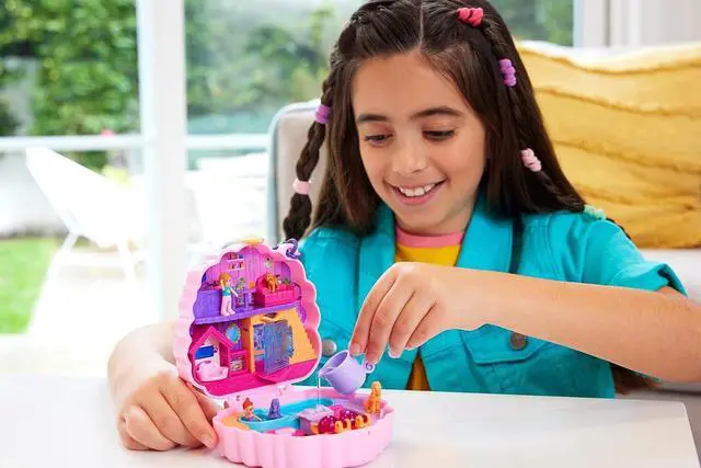 This Polly Pocket Groom and Glam Poodle Compact opens to a pet spa theme with Lila doll and friend.