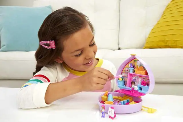 PlasticThe Polly Pocket Starring Shani Art Studio compact features an adorable heart-shaped case design with a paint brush and heart icons on the exterior and comes with micro Shani and friend dolls