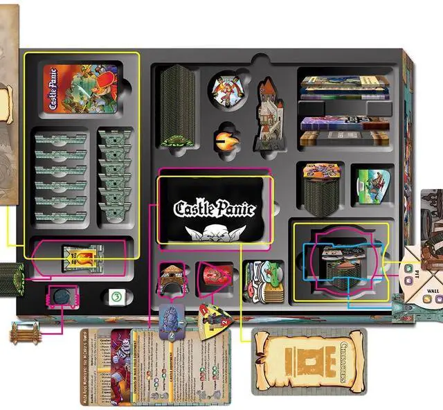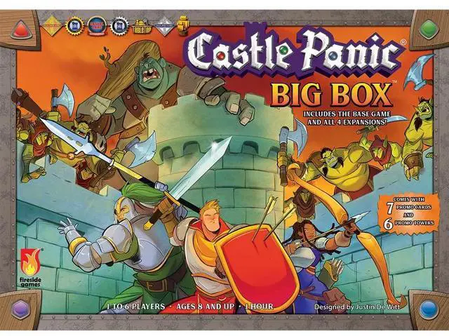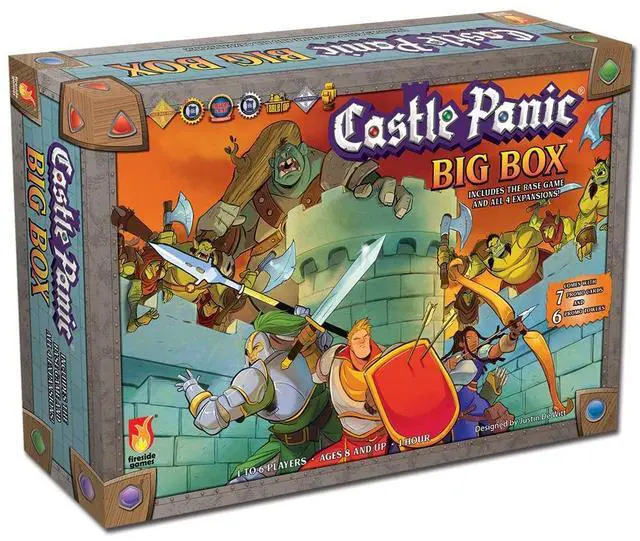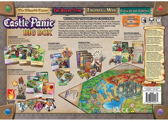 castle Panic Big Box is the complete all-in-one collection It includes the base game (castle Panic), 4 expansions (The WizardAs Tower, The Dark Titan, Engines of War, and crowns and Quests), and 13 promo items, all in the new art style of second edition