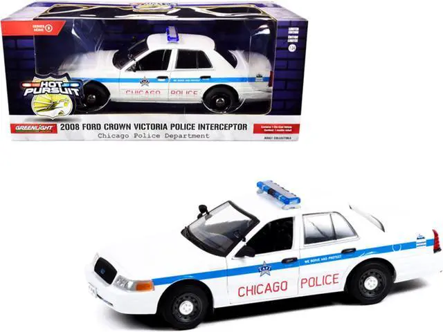Brand new 1/24 scale diecast car model of 2008 Ford Crown Victoria Police Interceptor "CAPS" White with Blue Stripes "Chicago Police Department" "Hot Pursuit" Series die cast model car by Greenlight.