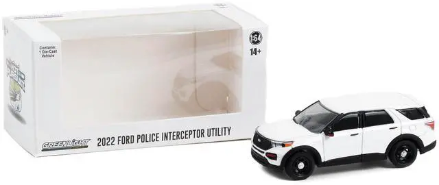 Brand new 1/64 scale diecast car model of 2022 Ford Police Interceptor Utility White "Hot Pursuit" "Hobby Exclusive" Series die cast model car by Greenlight. Limited edition. Brand new box. Detailed exterior. Real rubber tires. True-to-scale detail. Authentic decoration. Officially licensed product. Die-cast metal body and chassis. Dimensions approximately L-3 inches long. Manufacturer's original unopened packaging.