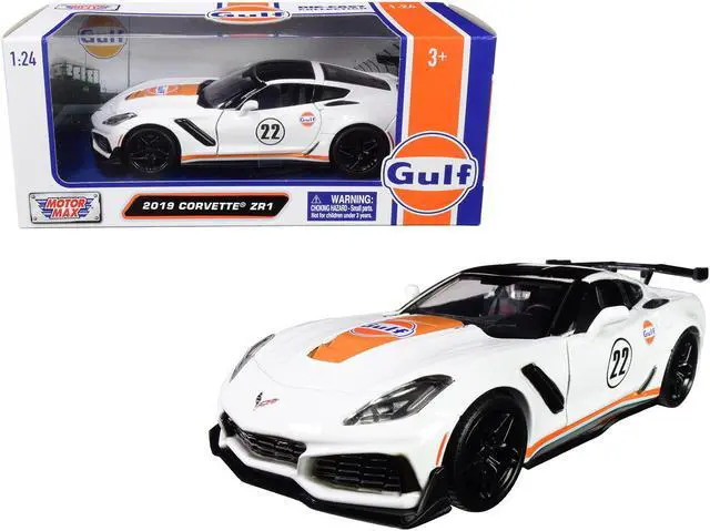 Brand new 1/24 scale diecast car model of 2019 Chevrolet Corvette ZR1 #22 "Gulf Oil" White with Orange Stripes and Black Top die cast model car by Motormax. Brand new box. Real rubber tires. Has opening doors. Detailed interior, exterior. Made of diecast with some plastic parts. Dimensions approximately L- 7.25, W- 3.25, H-2 inches. Please note that manufacturer may change packing box at any time. Product will stay exactly the same.
