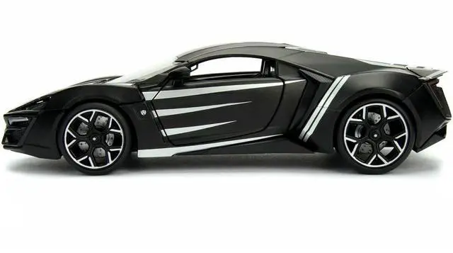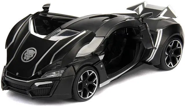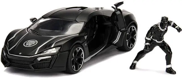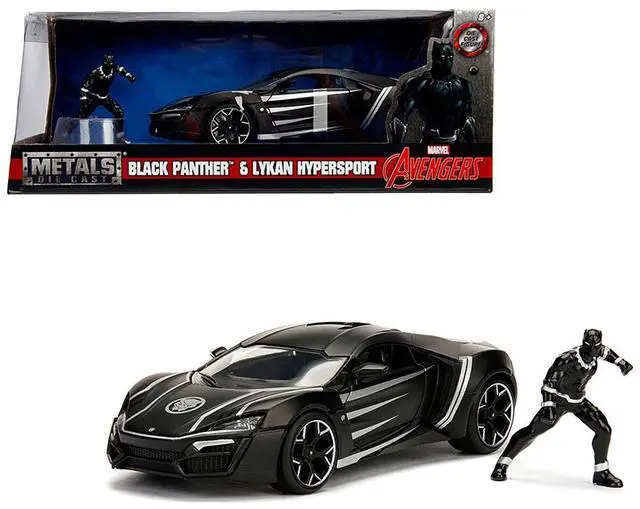 Brand new 1/24 scale diecast car model of Lykan Hypersport Black with Black Panther Diecast Figurine "Avengers" "Marvel" Series die cast model car by Jada.