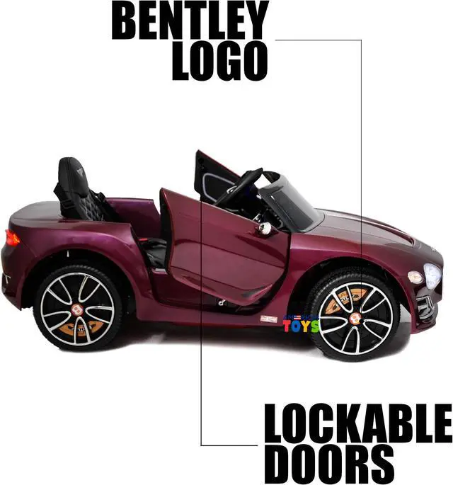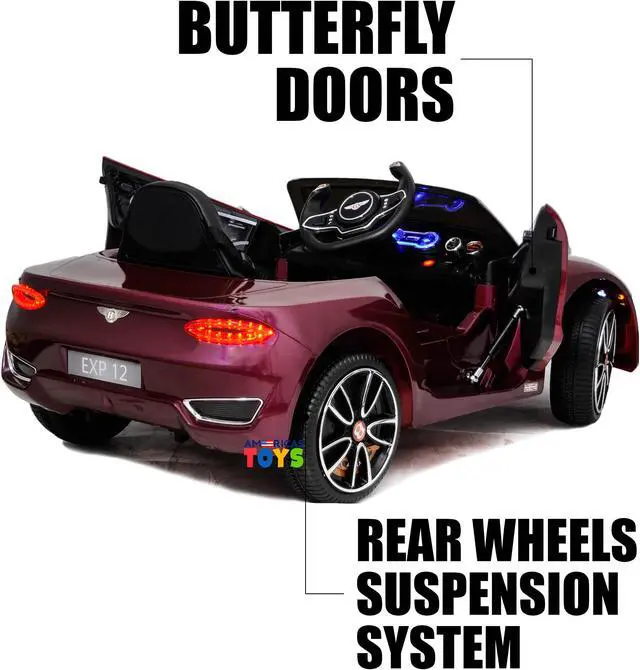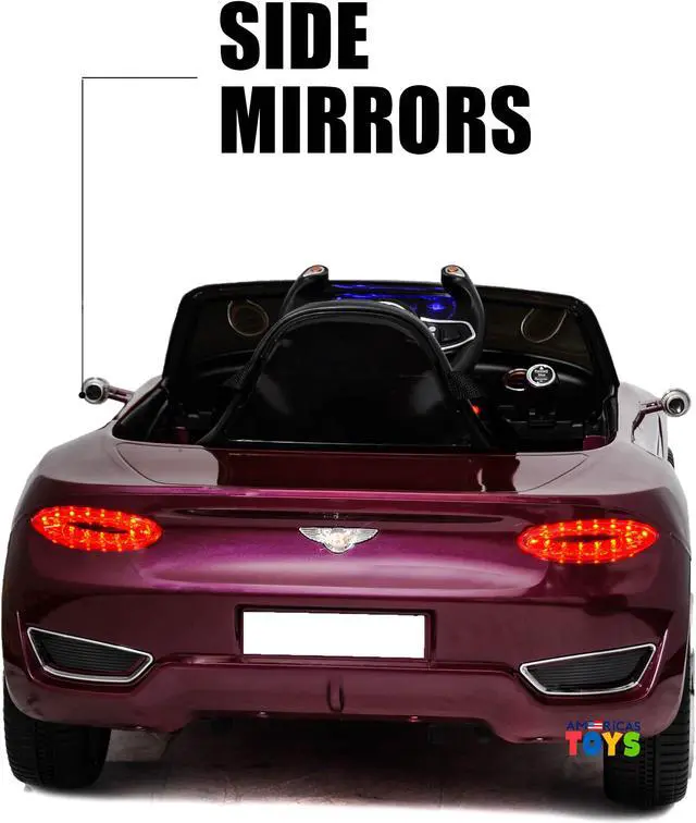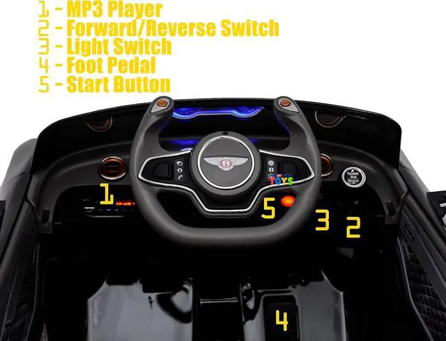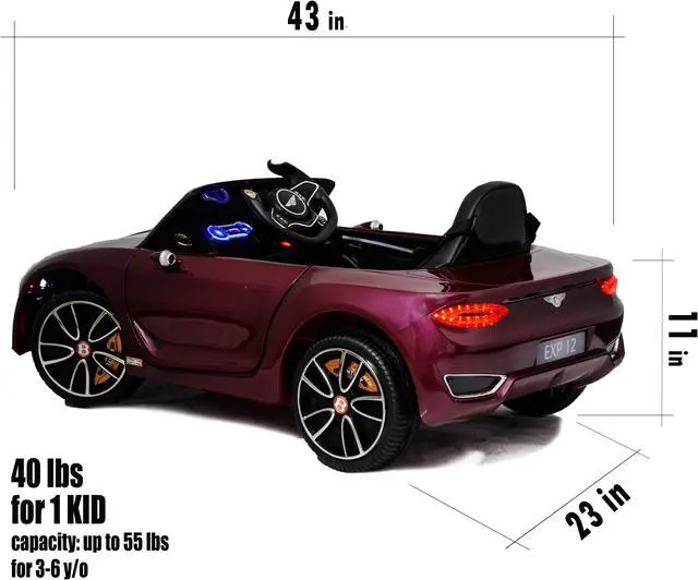 The electric car Bentley is a licensed car in the shape of concept car from Bentley The children's car is equipped with a plastic seat and wheels that will provide smoothness of the car. Ride on car Bentley will delight your child, because it is so similar to an adult car of the brand. A beautiful shiny exterior, scissors doors and an open top make the model very stylish. The speed of the kids car reaches 3-4 mph. Both your and your child can listen to music that is controlled by a MP3 multimedia system. In addition to the standard recorded melodies, you can play your music from SD Card, USB Flash Drive or connect your phone via AUX cord (not included). A kid can drive himself/herself, or can simply enjoy a trip while parents control it using a remote control. There is no need to worry about the safety, because there are safety belts. The features as in an adult's car. The electric car is equipped with plastic wheels and the rear ones are driving.