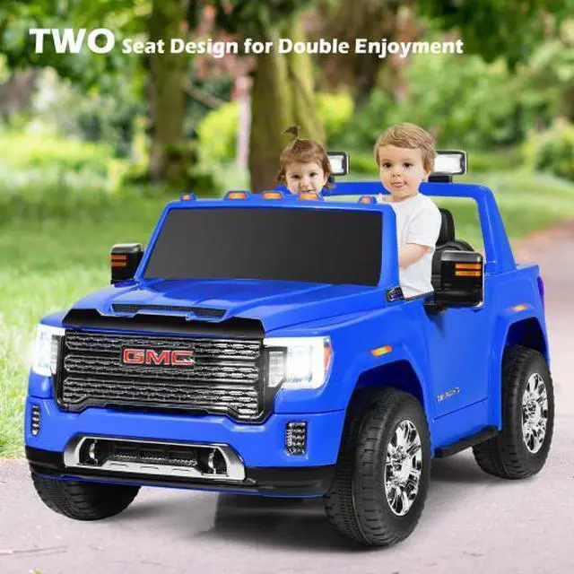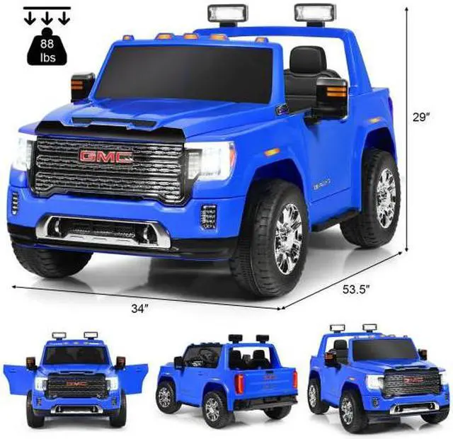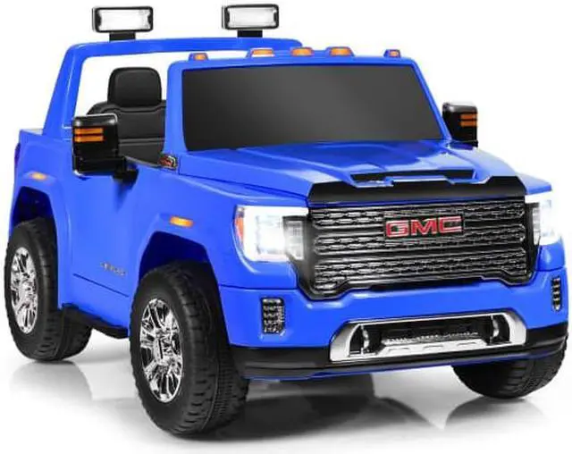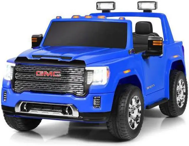 • A licensed GMC ride-on truck designed for children, featuring a blue color scheme.