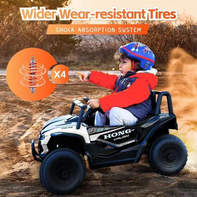 - **Safety First: Our ride-on UTV includes a 3-point safety belt, spring shock absorbers, lockable doors, and wide, wear-resistant tires to keep adventures smooth and secure.