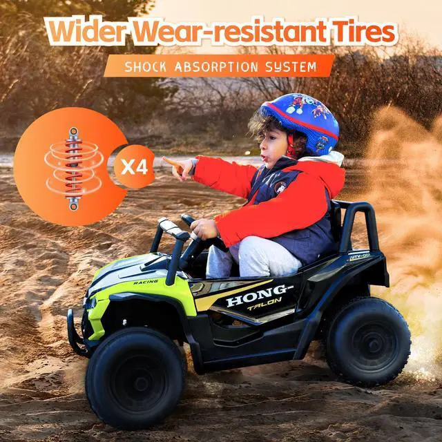 - **Safety First: Our ride-on UTV includes a 3-point safety belt, spring shock absorbers, lockable doors, and wide, wear-resistant tires to keep adventures smooth and secure.